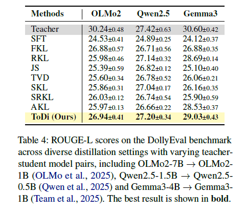 ToDi는 교사 모델과 학생 모델 간의 확률 비율(probability log-ratio)을 기반으로 시그모이드(sigmoid) 가중치 함수를 사용합니다. 이를 통해 각 토큰별로 FKL과 RKL을 유연하게 결합하여 학생 모델이 교사 모델의 지식 분포를 훨씬 더 정밀하게 따라할 수 있게 합니다.